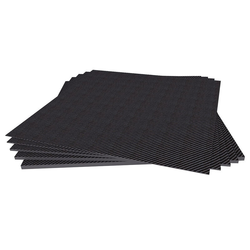 These high-quality carbon fiber sheets come in various thicknesses, made from 100% 3K plain weave carbon fiber and finished with a matte surface on both sides. Unlike many low-cost carbon sheets that are made by pressing two outer skins of carbon fiber over a carbon and resin core, these plates are made with layered sheets of carbon fiber and resin, making them the same strength all the way through.